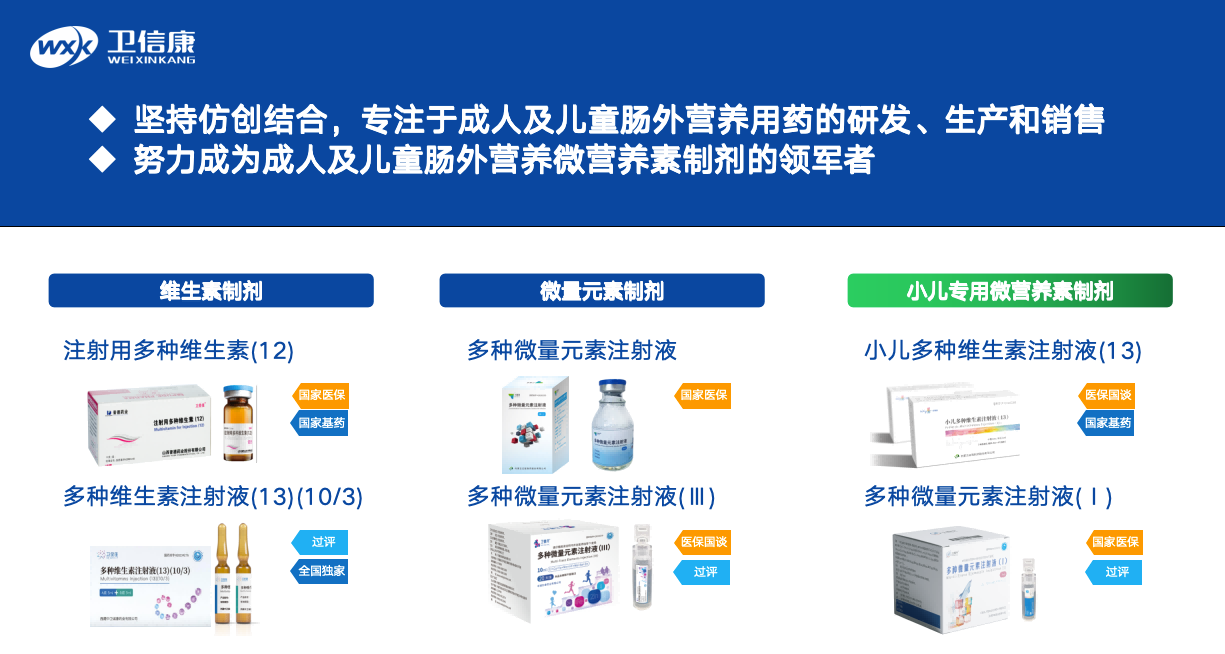 多年來,衛(wèi)信康深耕腸外營(yíng)養(yǎng)微營(yíng)養(yǎng)素制劑的研、產(chǎn)、銷一體化運(yùn)營(yíng),產(chǎn)品管線覆蓋了成人和兒童領(lǐng)域的多種維生素、微量元素等制劑品種,目前已成為該細(xì)分領(lǐng)域的國(guó)內(nèi)優(yōu)勢(shì)企業(yè)。已研發(fā)上市的核心產(chǎn)品涵蓋:注射用多種維生素(12)、多種維生素(13)(10/3)水針/粉針、多種微量元素注射液、小兒多種維生素注射液(13)、復(fù)方電解質(zhì)注射液(V)等。