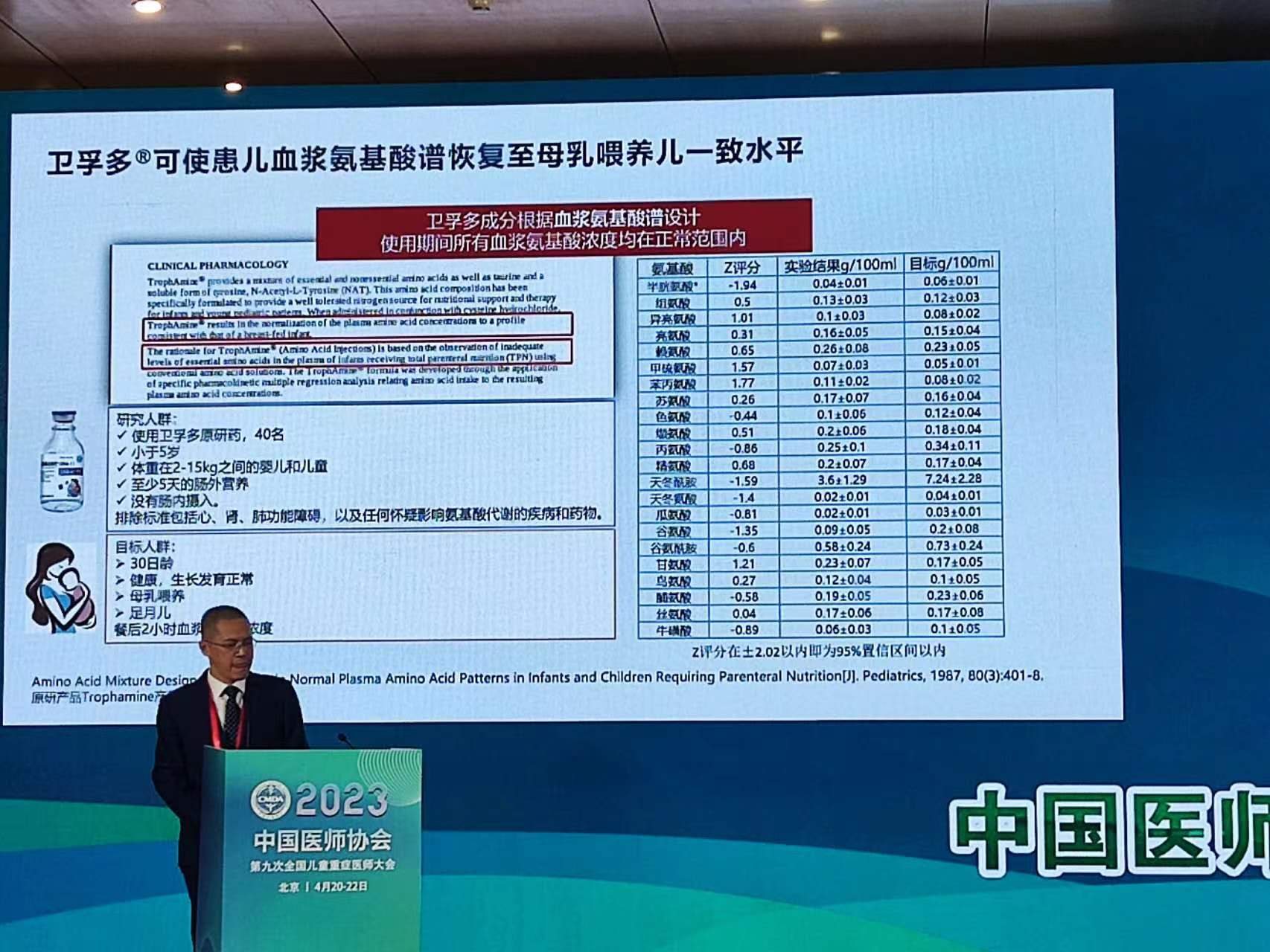 衛(wèi)信康醫(yī)藥攜衛(wèi)孚多?小兒復方氨基酸注射液(19AA-Ⅰ)及衛(wèi)優(yōu)佳?小兒多種維生素注射液(13),受邀參與本次大會,并有幸邀請到解放軍總醫(yī)院第七醫(yī)學中心兒童醫(yī)學部重癥醫(yī)學科洪小楊教授分享《氨基酸與多種維生素在危重癥患兒腸外營養(yǎng)支持(PN)中的應用》。